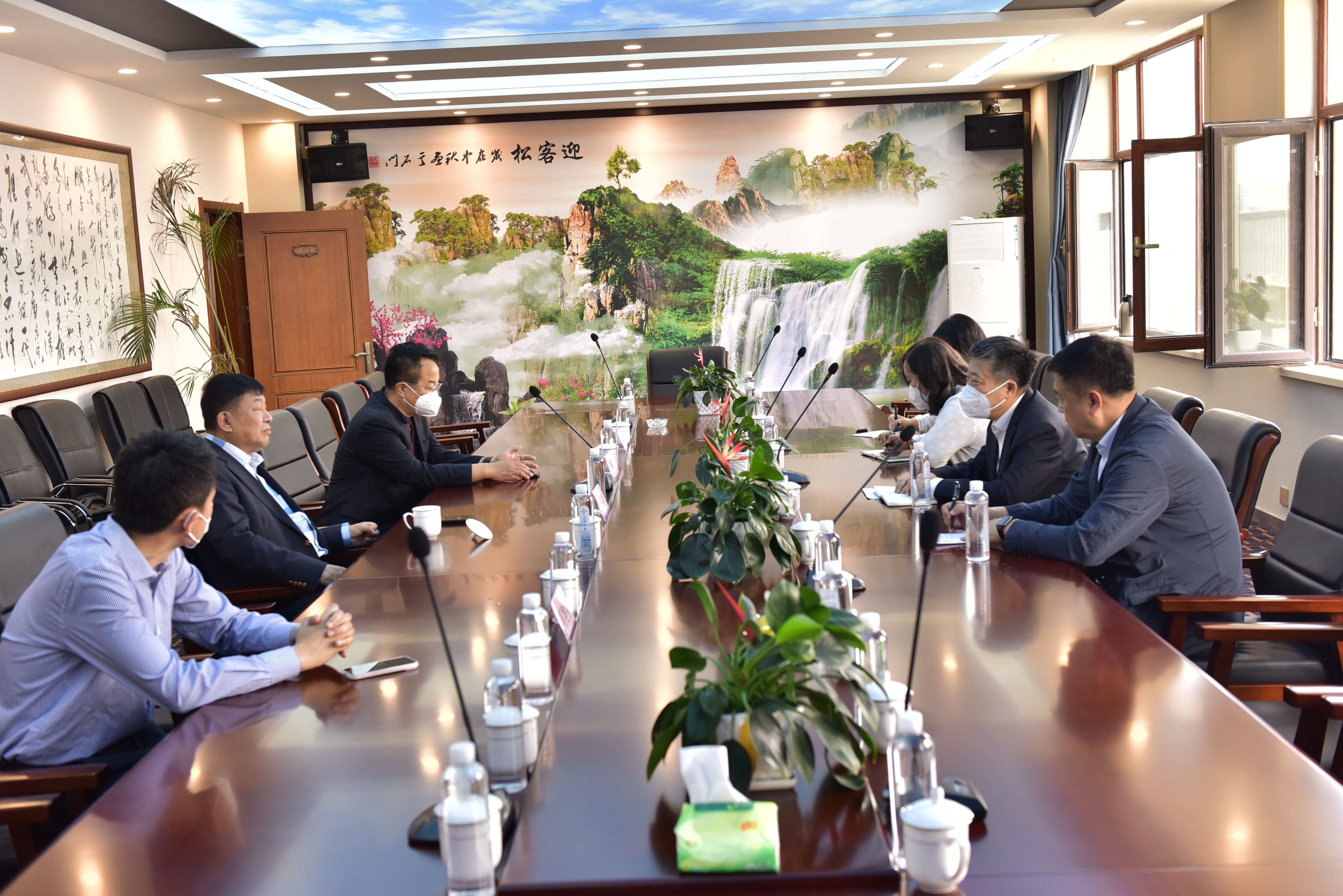 参观后,来到集团多媒体会议室,集团领导与市外办调研组进行进一步的交流座谈。公晓颖董事长向市外办调研组介绍集团最近的发展情况、集团对外投资和对外贸易开展情况;韩英彪总经理向调研组介绍了集团在莲花山正在建设的北药养生谷项目情况。